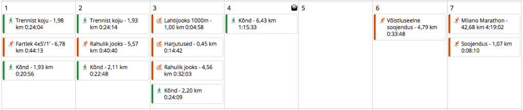Maratoninädalal tegin täiesti tavalisi trenne, kannatasin teiperi ära ja käisin neljapäeval Herje juures massaažis. Pärast maratoni ei teinud nädal aega üldse mitte midagi. Kaks nädalat kahe lausega kokku võetud! Sellel nädalal naasesin tasapisi jooksurajale.