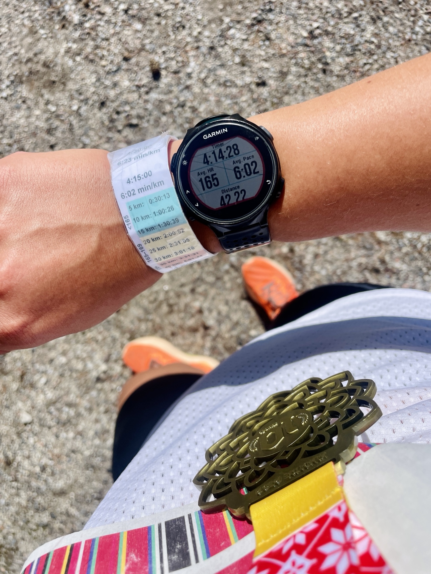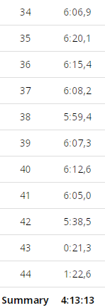 Jõudsin jälle imeilusa männimetsa alla. Tegin kõrgemat matemaatikat ja arvutasin elu eest, kas jõuan ikka alla 4:15 finišisse – ma polnud selles üldse enam nii kindel. Käepaela järgi olin 40 km peal täpselt ajas. Enam midagi kuskilt juurde panna polnud, jooksin niigi enda piiri peal. Viskasin kivikese 2 km enne finišit viimaks maha.