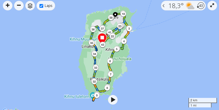Kihnu maratoni rada koosneb kahest 21,1 km ringist, millest esimese saab joosta koos poolmaratoonaritega. Rajal on vähemalt poole ulatuses asfaltkate, võib-olla isegi rohkemgi? Lisaks jupike metsaradu ning kruusateid. Saare kõrgeim punkt on 8 meetrit, seega üpris lame maraton. Kohe kindlasti kiirem rada kui näiteks Tallinna Maratonil või Tartu Linnamaratonil. Rada oli eelmisest kahest aastast väga tuttav. Joogipunkte oli neli: 4, 9, 14 ja 19 km peal, lisaks paar kohalike korraldatud isetekkelist punkti. Ajavõtt kiibiga. Kõik on olemas.