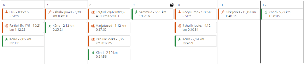 Kolmapäev: JJV (lõigud). Esimene lõigutrenn. Nagu arvata oli, siis tulid 200-meetrised. Soojendus sai päris pikk, sest hakkasime enne trenni ametlikku algust pihta (5.25 km, 7.08 min/km, 138 l/min). Seejärel hulgim jooksuharjutusi ja dünaamilisi venitusi pluss paar lahtijooksu. Jalad kõige värskemad polnud.