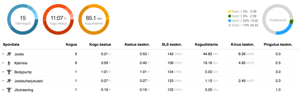 Reede: rahulik jooks + BodyPump. Kuna reedel pidi suur torm olema, siis plaan oli pikk jooks jätta laupäevale. Reedeks seega väike rahulik soojendusjooks (4.12 km, 7:25 min/km, 132 l/min) ja BodyPump. Pumpis oli kõik hästi, kuniks enam polnud. Kükid tegin ilusti lisaraskuseta, sest jalad alles taastusid lõigutrennist ja pidid järgmise päeva pikaks otsaks okeid olema. Tegin kükke ja poole loo pealt all olles tunnen, et mingi jõnks käis läbi ja enam järgmise kükiga alla välja minna ei saa.