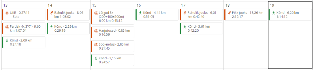 Esmaspäev: Jooks Jõud Venitus. Fartleki päev. Sel nädalal andis treener meile ülesandeks 4 korda 3 minutit kiiret üle 7 minuti rahuliku jooksu. Alla saime teha korraliku soojenduse. Minu reedel viga saanud selg oli nagu okei, aga samas imelik, eriti pikema sammuga. Kogu alakeha oli pinges ja kuidagi off. Tegin ettevaatlikkusega trenni ära.