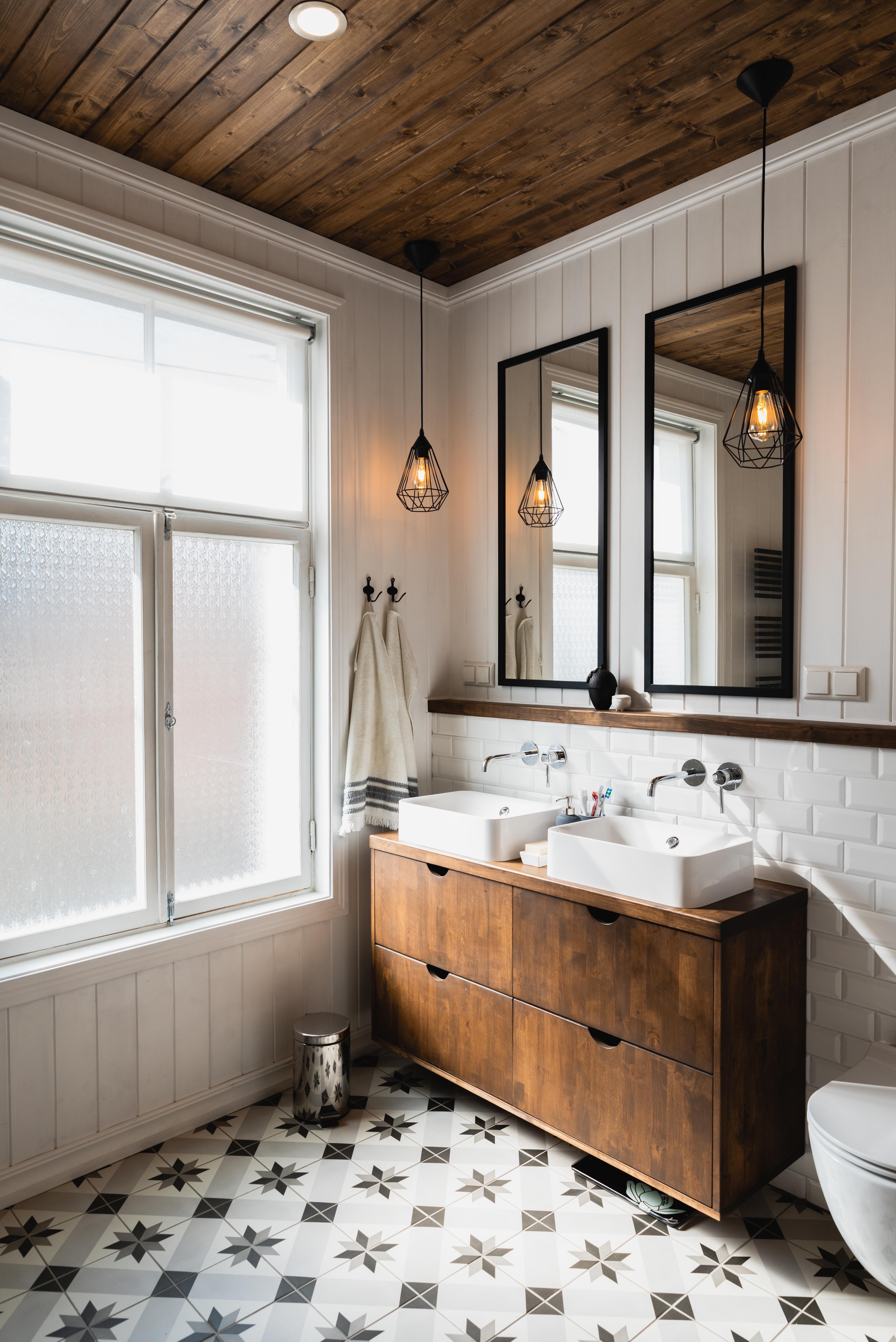 Vannituppa soovisime midagi valgust läbilaskvat, ent mitte liialt läbipaistvat. Esialgu sai sinna paigaldatud Ikea Skogsklöver valge ruloo, kuid katsetused täisvõimsusel valgustusega näitasid siiski, et pimedas paistab see vannitoa jaoks natuke liiga palju läbi. Kuna vannitoa aken asub meil tänavapoolsel küljel, ei saanud seda nii jätta. Külgkardinad vannituppa ei tundunud just parim idee, pimendav ruloo ei lase päeval teragi valgust sisse, ribikardinate vahede järjepidevaks tolmust puhastamiseks olen ma liiga laisk… Lõpuks kleepisime aknaklaasid iseliimuva mustrilise kilega üle ja see täiendus koos olemasoleva rulooga lahendas probleemi ideaalselt.