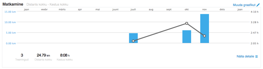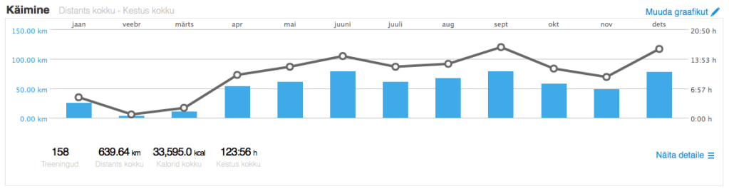 Selle aasta tõeline kangelane oli kõndimine. Jätkasin oma igapäevast 10 tuhande sammu väljakutset, jõudes aasta lõpuks 470-päevase streakini. Läbisin kõndides ja matkates aastaga üle 1000 km, ületades pika puuga isegi oma südamehaiguse ‘tippaasta’ aegset maksimumi, mis oli veidi üle 600 km. Igapäevane tööle ja tagasi kõndimine ning iganädalane pikem kõnniring trennivabal päeval tõi nii kaugele.