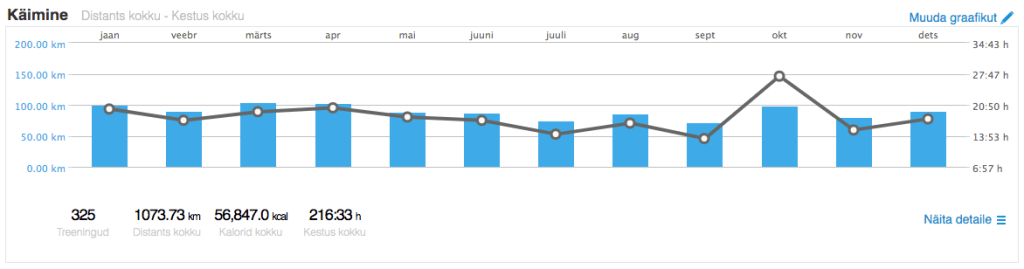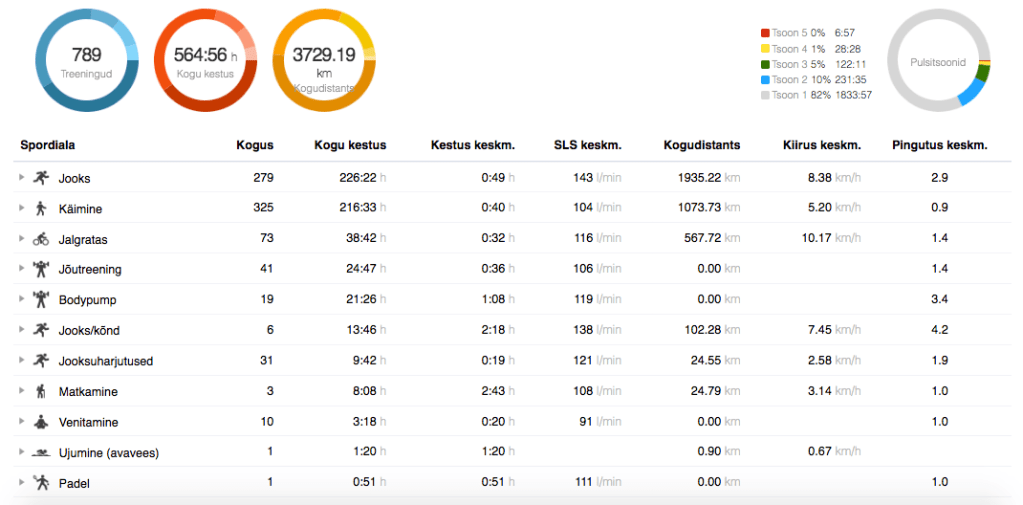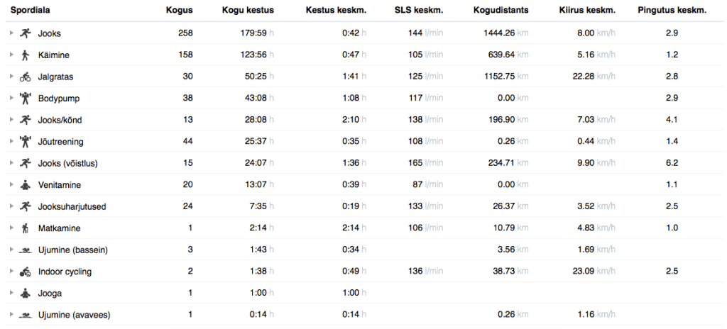 Koos kõigi muude aktiivsete tegevustega, mis eeldavad sammude tegemist ehk ratas ja ujumine välja arvatud: 5 894 248 sammu aastas, keskmiselt 16 104 päevas. Vinge!