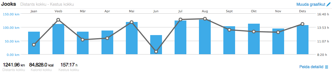 Jooks on ainus asi, mida ma sellel aastal rohkem teinud olen kui eelmistel aastatel (1208 km vs 1242 km). Kõige rohkem jooksin augustis (129 km), kui valmistusin maratoniks, kõige vähem aga juunis (71,37 km), kui sai rohkem teisi triatlonialasid tehtud. Üldiselt näeb graafik eelmisest aastast siiski mõnevõrra erinev välja. Hea meel on selle üle, et ühtegi kilometraaži vähenemist ei ole põhjustanud vigastus(ed). 🙂