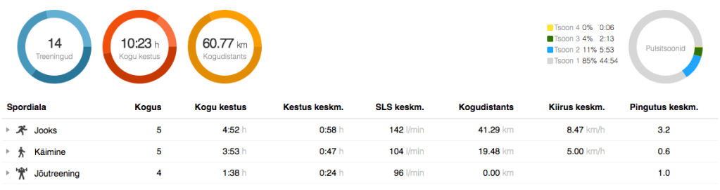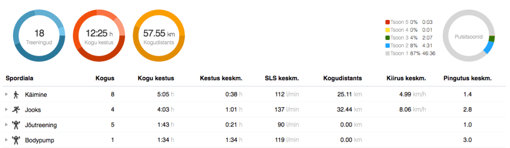 Teisipäev: rahulik jooks. Võtsin eesmärgiks 6 km sisehallis pärast tööd. Inimesi oli omajagu, aga aeg läks üksi joostes ootamatult kiiresti ja lõpuks tegin kuue asemel kaheksa ehk tund aega. Enesetunne oli hea ja jõudu isegi jagus, üle tüki aja selline lubav olek ja minek. Täitsa hea. (8.18 km, 7:23 min/km, 136 l/min) Pärast tegin hallis oma füsioharjutused ka ära, lisaks veel üht-teist puusale juurde (27 min, 110 l/min).