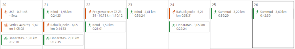 Esmaspäev: Jooks Jõud Venitus. Fartlekipäev. Sain teisipäevaks hambaarsti aja ja tegin veel ühe viimase jooksu, teadmata, kas mu hammas jääb alles. Treeneril oli meile väike fartlek välja mõeldud, seega tegin selle kaasa, 4 korda 3 minutit kiiret üle 7 minuti rahuliku. (8.52 km, 7:09 min/km, 138 l/min) Kiired osad: