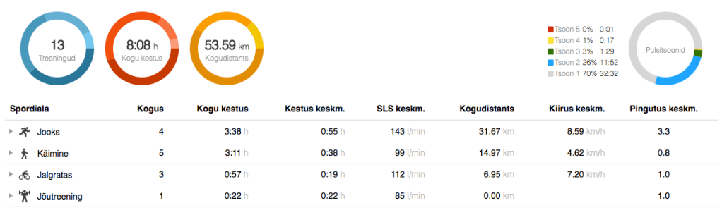 Laupäev: BodyPump. Laupäeval võtsin julguse kokku ja läksin üle kuu aja Pumpi. Ehk on nüüd piisavalt selga ja puusasid tugevdatud, et mitte kohe katki minna. Meie Treeneri tund, seega saab usaldada, et seal pole vaja nii hullult rahmeldada, ohtlikke/totraid kombosid teha ja keegi ei vaata viltu, kui teen kergete raskustega ja oma keha kuulates. Oli täitsa okei, jalad võttis korralikult all tudisema ja pühapäeval sain ka lihasvalu maitsta. Oma puusatõsted tegin iseseisvalt tunni lõpus. (57 min, 120 l/min)