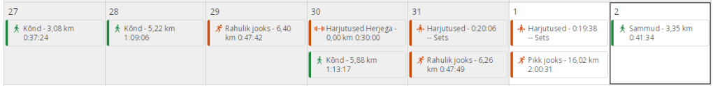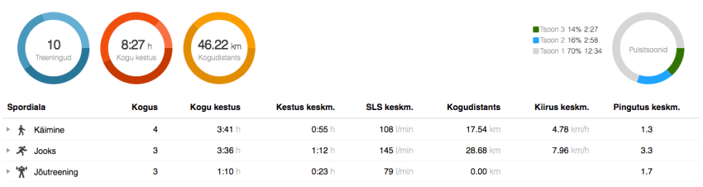Esmaspäev: rahulik jooks. Õhtul oli viimaks selline tunne, et viirus on taastunud, kõhus oli peaaegu rahu majas ja võib jooksma minna. Tegin rahuliku 6 km ringi männimetsa vahel. Raske ja energiast tühi, aga ikka oli tore. (6.16 km, 7:19 min/km, 139 l/min)