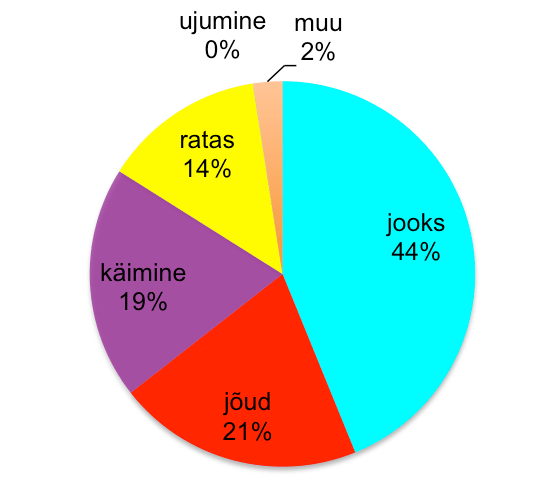 | Kõndimine ja matkamine | 19% | 28% | 51% | 3% | 2% | 3% | 1% | 11% | 13% |