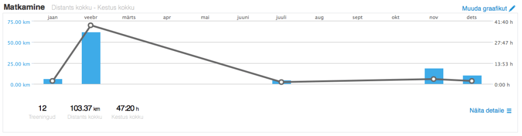 Eelmise aasta 90 tunnile ja 443 kilomeetrile on sel aastal vastu panna 74 tundi ja 227 kilomeetrit. Kilimanjaro tõusumeetrid kompenseerivad vahe.
