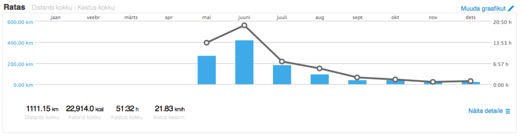 Jalavigastus, mis joosta ei lase, on mu alati viinud ratta selga. Eelmise aasta 181 kilomeetrile on sel aastal vastu panna võimsad 1111 kilomeetrit. Mais ja juunis kogusin kilomeetreid ja tunde rattal rohkem kui eales varem ning jätkasin väikseid rattatiire jooksutrennide vahele kuni sügiseni. Võib öelda, et uue rattavarustuse alla pandud raha vähemalt tasus end ära. Nüüd on mul ka pukk, millega vajadusel talvel toas rattaga sõita saab. Härra Jooksja oma vigase jalaga sai selle võimaluse rõõmusid nautida terve sügise.