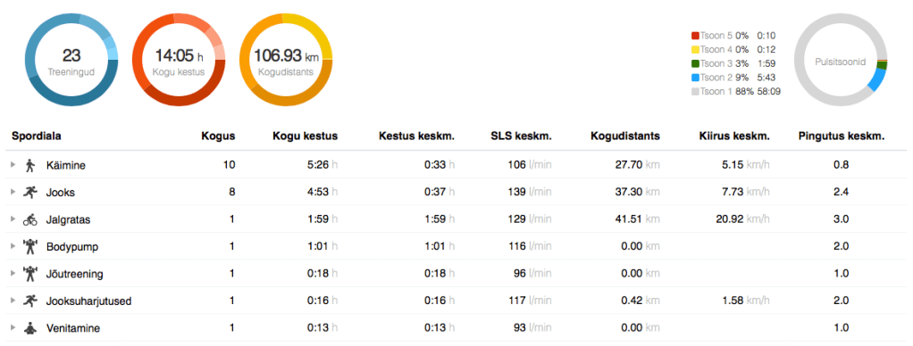 Esmaspäev: Jooks Jõud Venitus. Fartlekipäev. Enne trenni ei saanud aru, aga jalad olid üpris tühjad. Õnneks fartlekis tippkiirusi arendama ei pidanud. Sellel nädalal ootas ees 4 korda 3 minutit, 2 minutit ja 1 minut, igale lõigule sama palju rahulikult vahele, kokku tund koos väikese soojenduse ja mahajooksuga. Tempod ja pulsid (9,63 km, 6:15 min/km, 154 l/min):